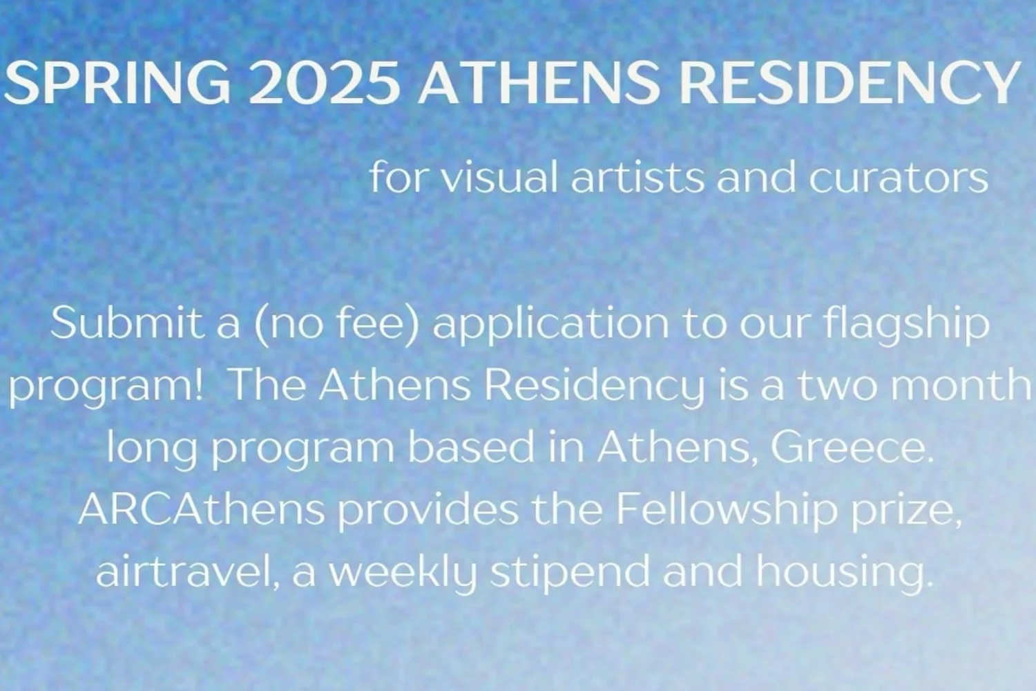 ARCAthens' flagship Athens Residency offers fully-funded 2-month fellowships for visual artists, curators, and scholars. Includes housing, $2,000 prize, weekly stipend, air travel. Open to non-Greek residents; features networking and public events.